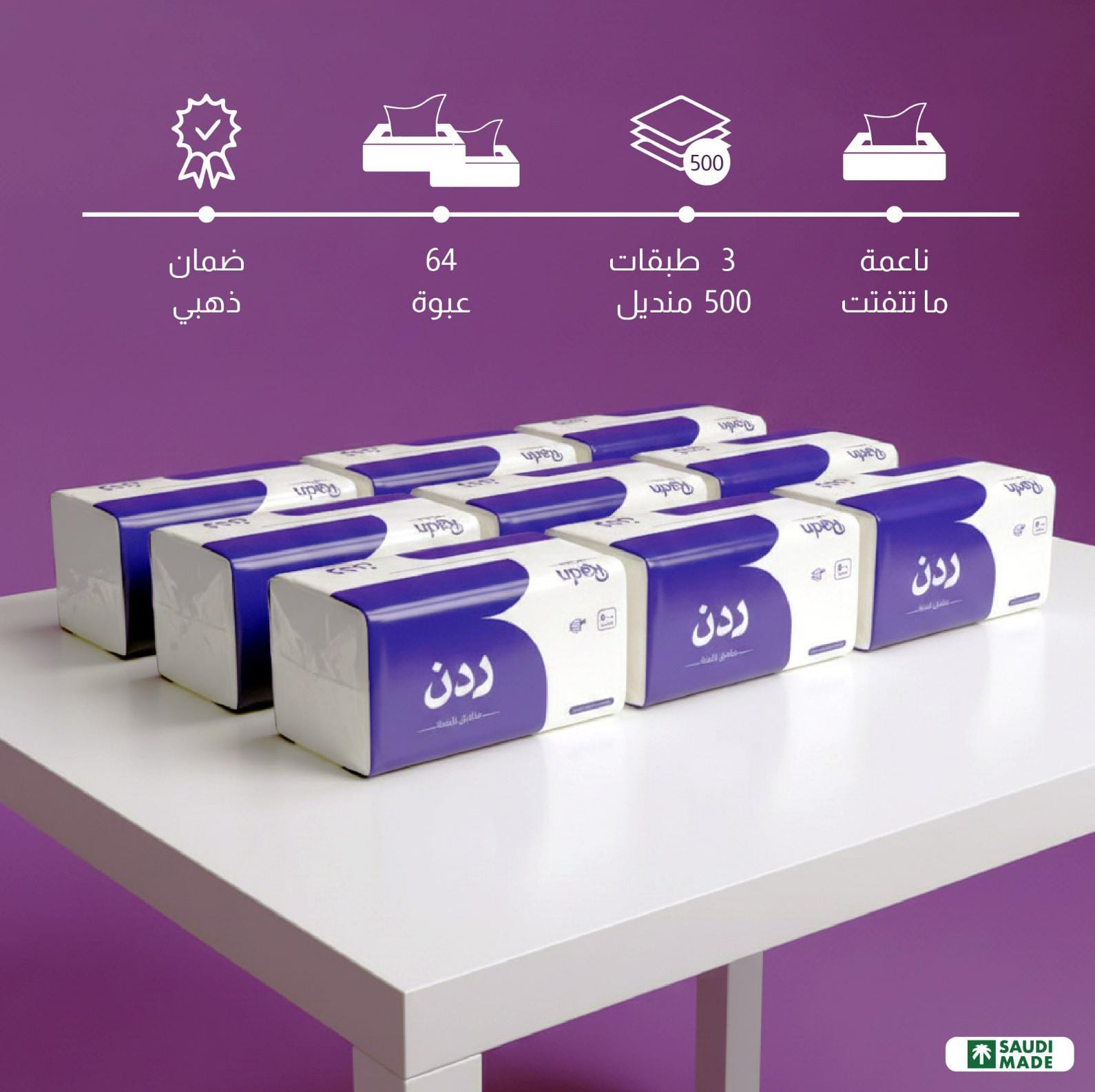 • عدد الطبقات: 3 طبقات في كل منديل لتعزيز المتانة والراحة.